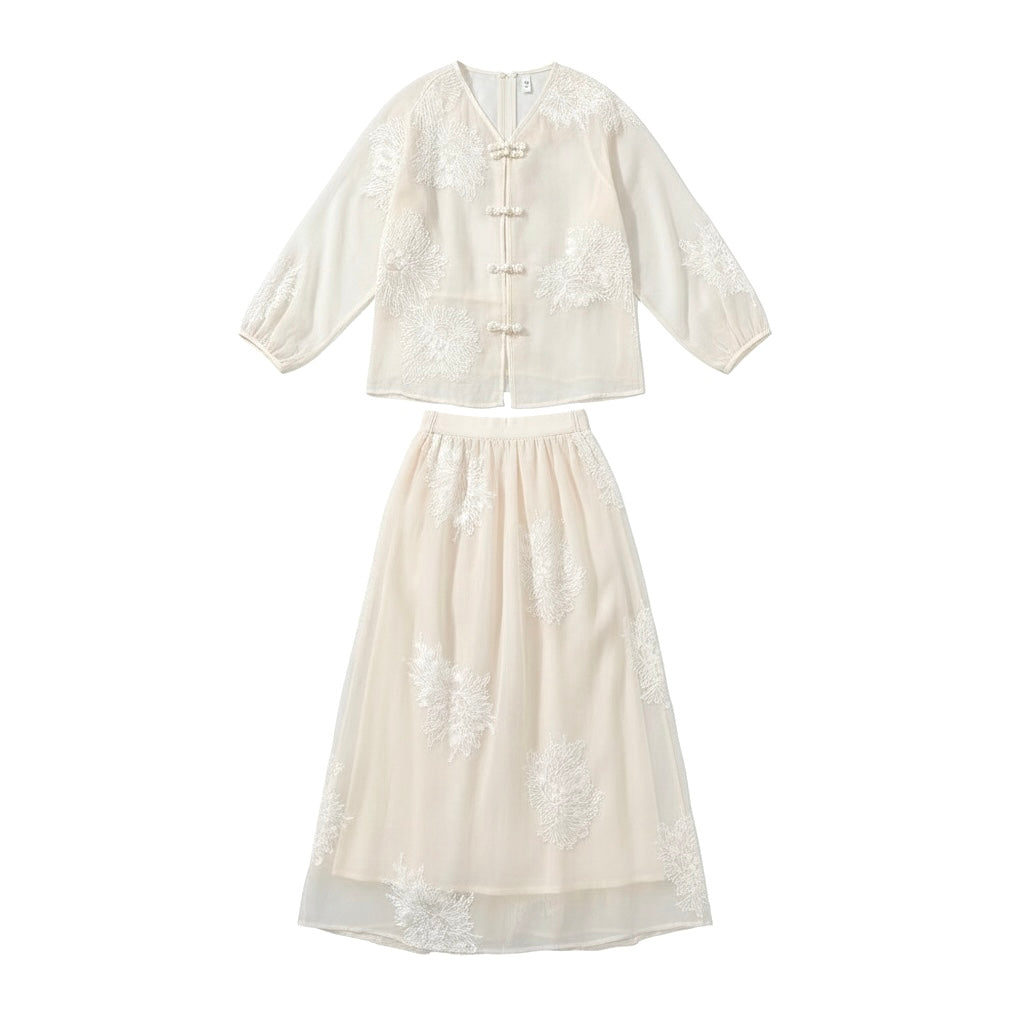 The CNY 26’ Fiona Set is crafted from breathable cotton linen, featuring delicate embroidery on the top for a refined festive touch. Designed with traditional Chinese knot buttons, the top pairs effortlessly with a matching long maxi skirt made from the same comfortable material. The skirt comes with an elastic waistband, offering ease of wear while maintaining an elegant silhouette.